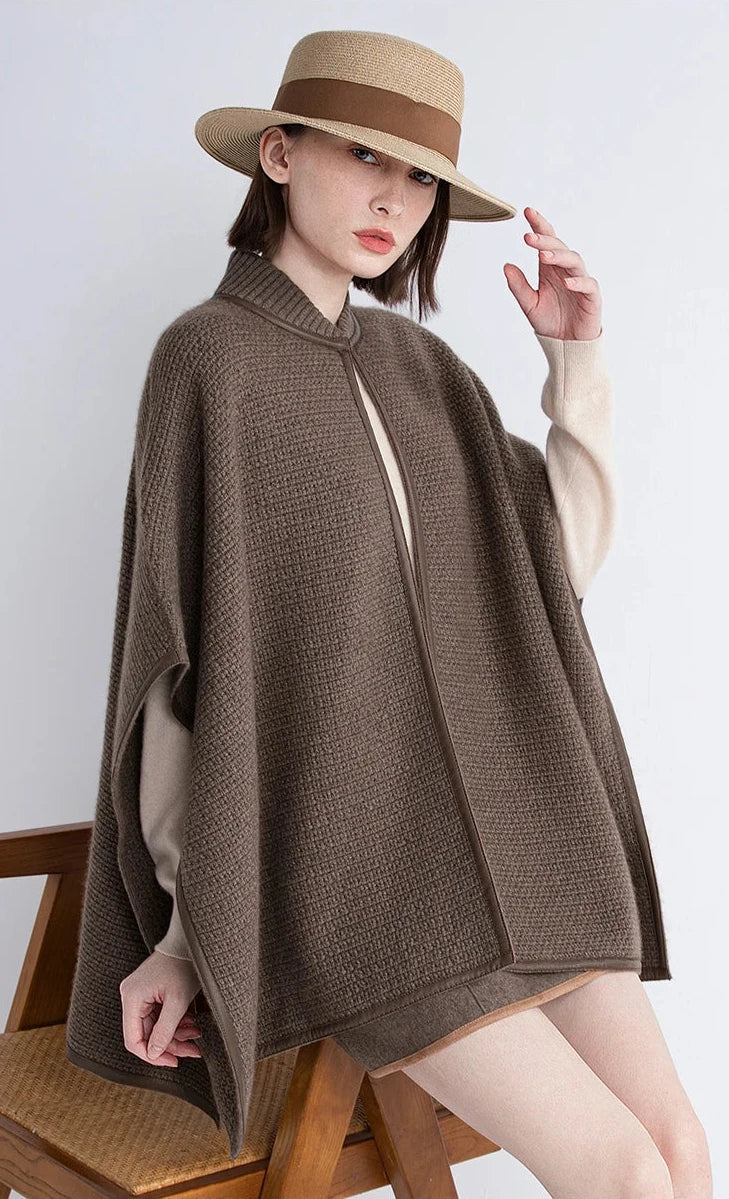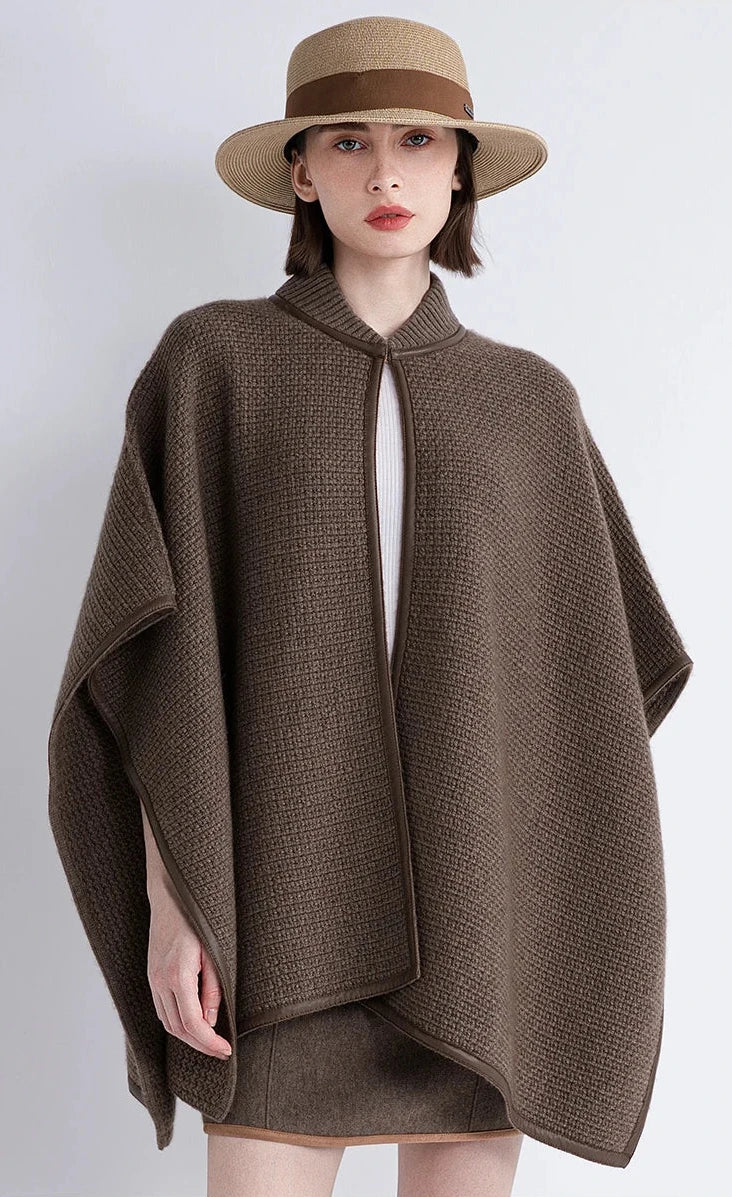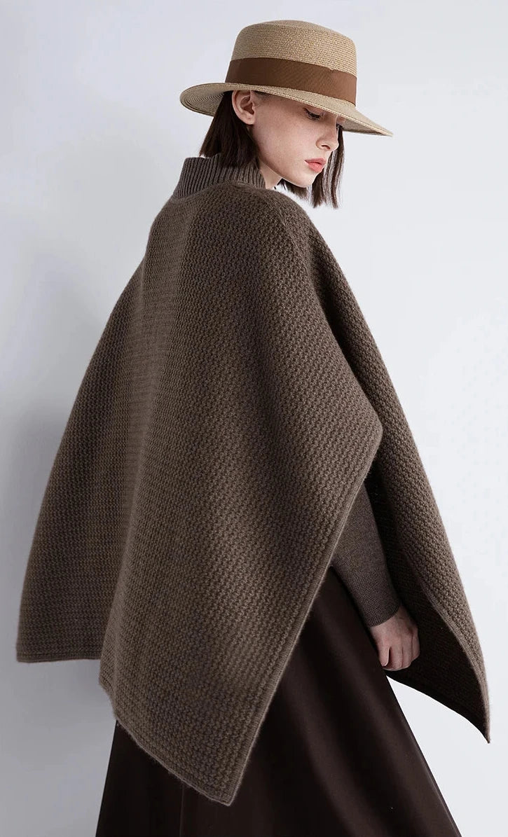 Woven in a  brown thick rich cashmere-wool blend and trimmed with refined leather hem.  This cloak echoes the warmth of Macedonian earth and artistry of ancient craft.