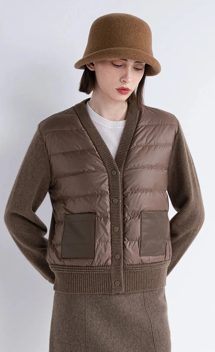 A cashmere coat washed in umber noir hue, softened by the breath of white goose down. Front pockets fall like gentle pauses, balancing form with quiet intention. A piece where warmth drifts like poetry, and elegance lives in stillness.