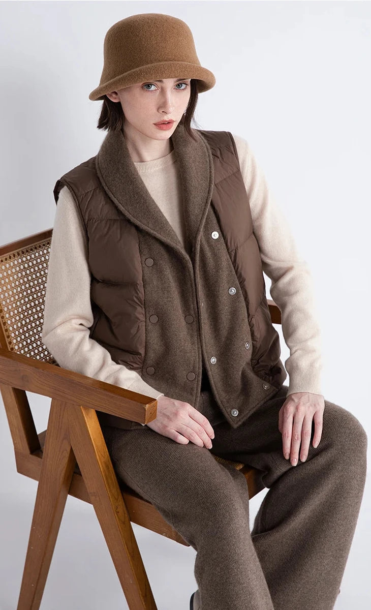 A double-breasted sleeveless jacket in royal cashmere, filled with white goose down for sculpted warmth. Its Umber Noir hue carries the depth of earth and the softness of quiet power.  An expression of warmth and devotion, shaped to rest effortlessly upon the body.