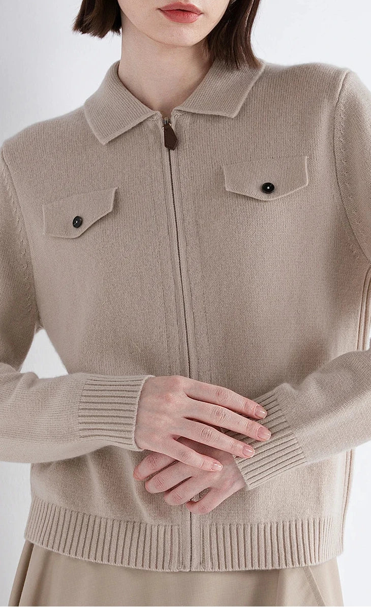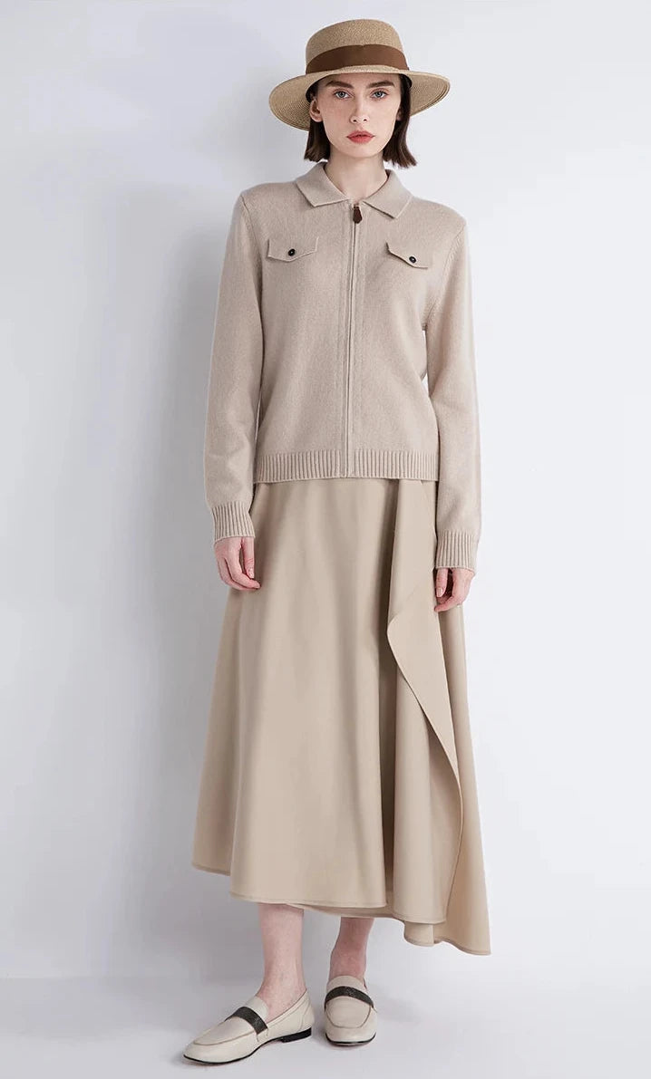 A cashmere-wool blend zip cardigan in Ecru hue , shaped with the softness of dusk. Two soft pockets rest like quite accents, tracing a gentle symmetry. A piece woven for moments when elegance feels like poetry.