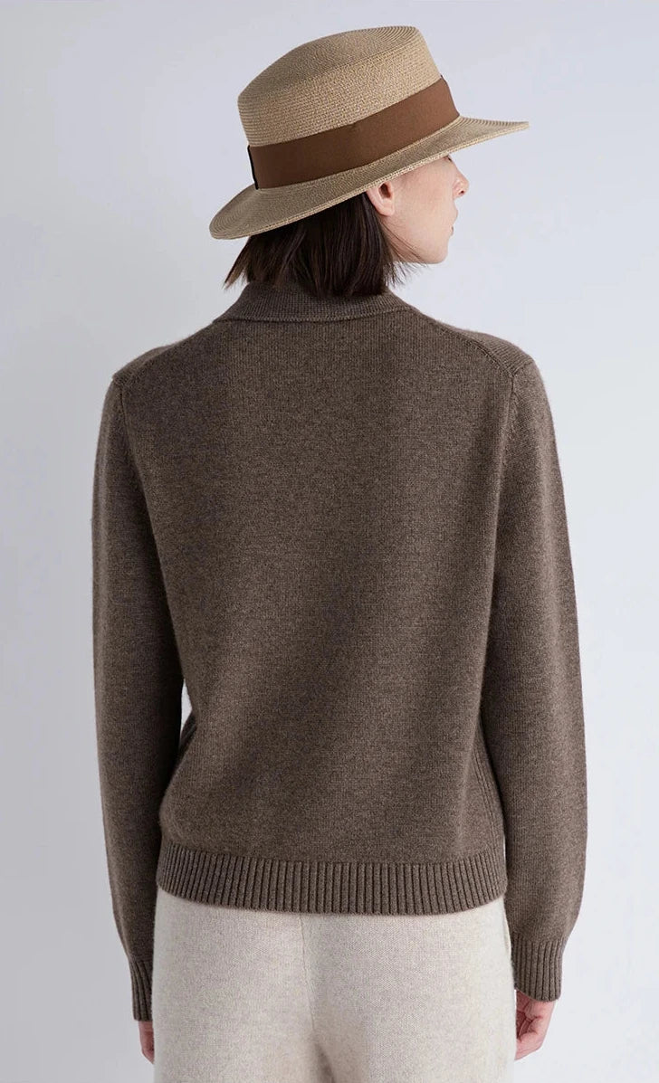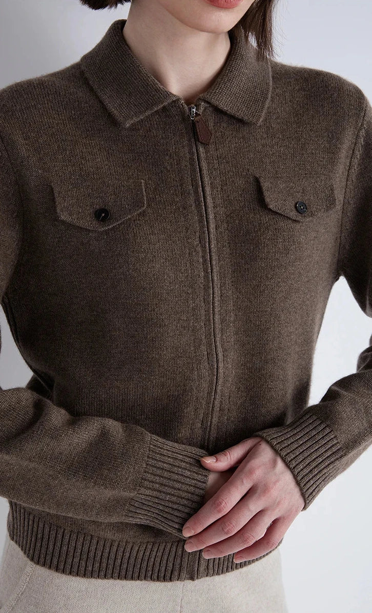 A cashmere-wool blend zip cardigan in deep umber noir, shaped with the softness of dusk. Two soft pockets rest like quite accents, tracing a gentle symmetry. A piece woven for moments when elegance feels like poetry.